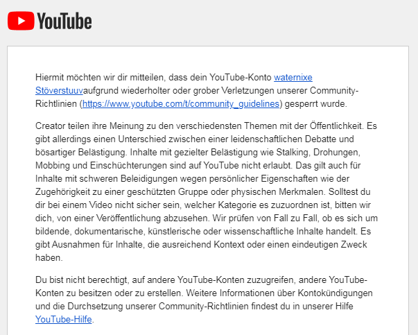 mein youtube Konto waternixe stöverstuuv ist nun gekündigt worden