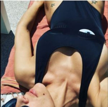Pentagramm auf beiden Beinen plus okkulte Augensymbolik auf dem Badeanzug: